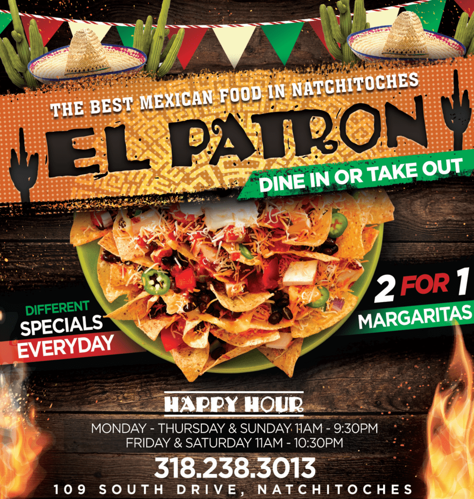 I designed this vibrant and eye-catching advertisement for El Patron Mexican Restaurant, renowned for serving the best Mexican food in Natchitoches. The ad promotes key offerings, including dine-in and take-out options, daily specials, and a 2-for-1 margarita deal during happy hour.